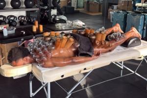 照片中的奥蓬达正在进行拔罐,他从颈部到小腿全部安上了各种材质的罐子。意大利媒体介绍称,拔罐是一种可以缓解疼痛和放松肌肉的皮肤疗法。