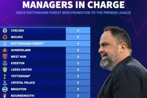 22-23赛季以来英超主帅人数榜:狼队7人最多,蓝军6人,森林将5人