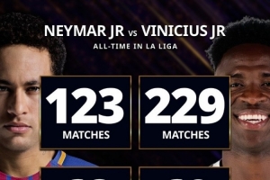 西甲数据对比:内马尔123场68球49助,维尼修斯229场69球46助