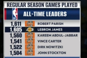 即将登顶!里程碑预警:詹姆斯出场1605场常规赛 距离第一只差6场